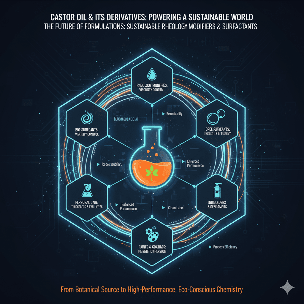 - Castor ethoxylates and other castor-derived esters as effective bio-surfactants and emulsifiers, enabling stable mixtures of oil and water.